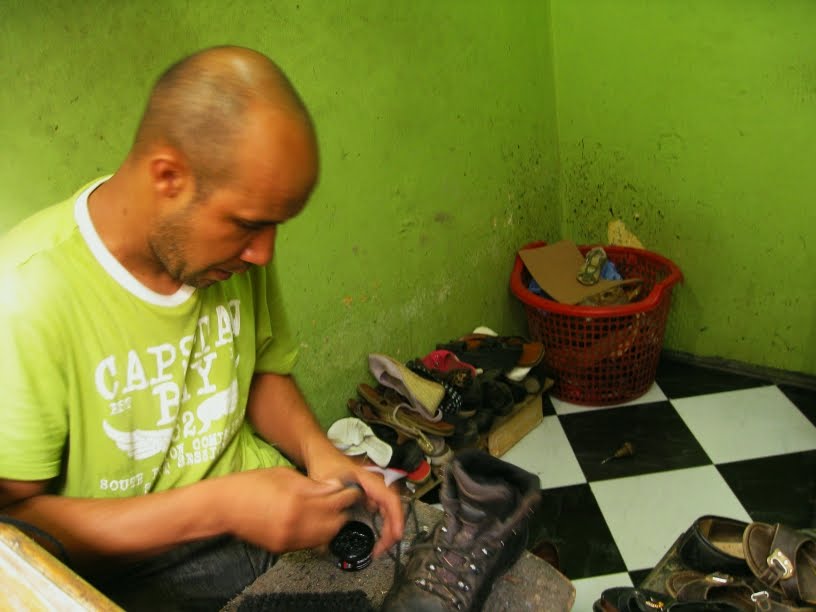 We go through hiking boots at an alarming rate. I suppose boot manufacturers don't count on people actually using their footwear more than two weeks a year. As a result, every couple weeks there's a new split seam, or the sole comes unglued, or some combination of the two (and then some...). This man ('shoe guy', or 'Assaan' as I'm sure he prefers to be called) fixes whatever is ailing our fatigued footwear, and for the flat rate of about 2 bucks a pair. He also tuts while he gives them a much needed polish.